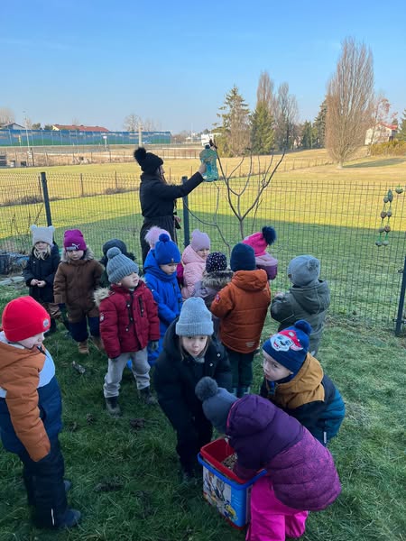 Dzieci powiesiły karmniki na placu zabaw i z okna swojej sali będą mogły obserwować ptaszki, które będą się częstować ziarenkami.🐦🐦⬛ Pluszaki wiedzą, że o zwierzaki można a nawet trzeba dbać także w zimę. ❄️🩵